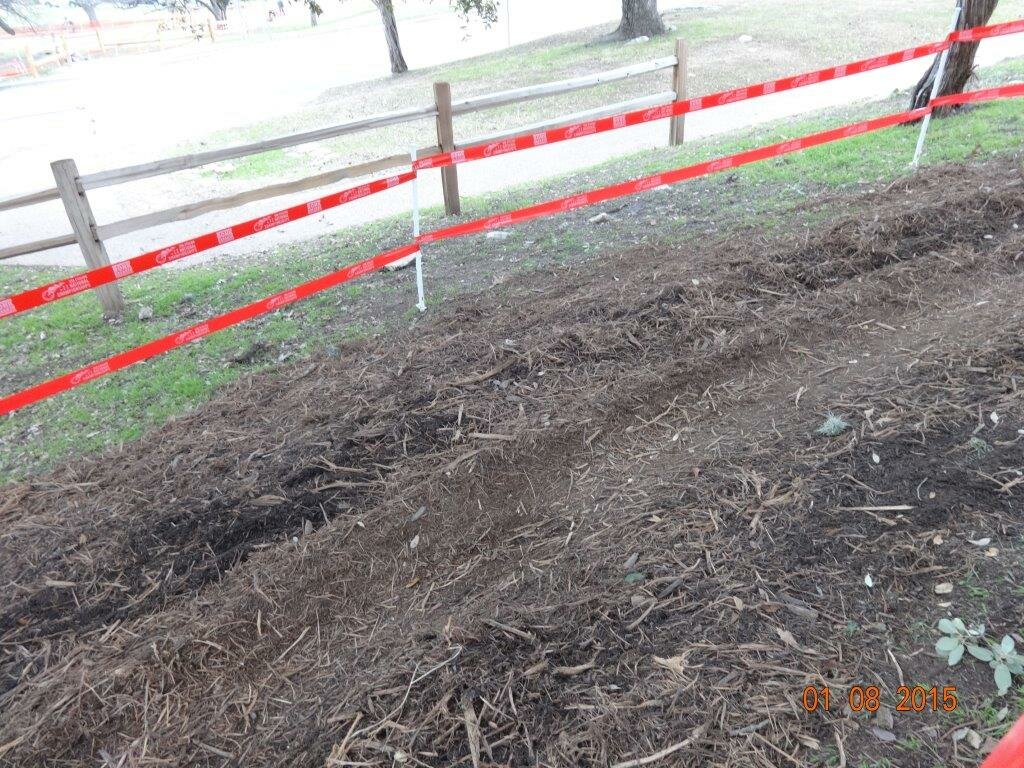 The pictures below show the damage to the tree root zones as of Thursday afternoon, before the faster races and the rain. The younger riders scheduled for Friday and Saturday, and the elite riders scheduled for Sunday will cause much more impact to the soil since they are stronger and will make more laps.